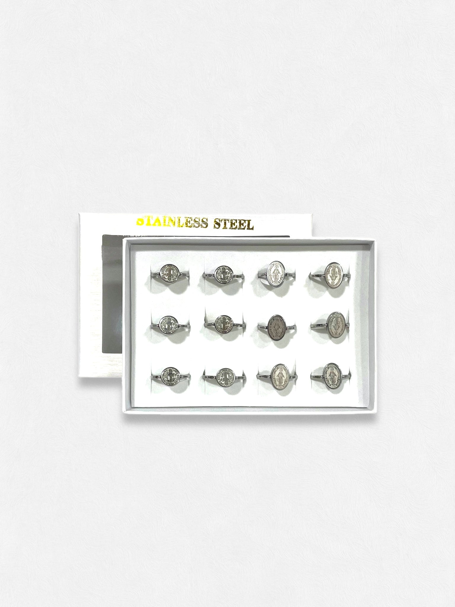 Presentación: 12 anillos en una caja. 6 anillos óvalos y 6 anillos redondos.