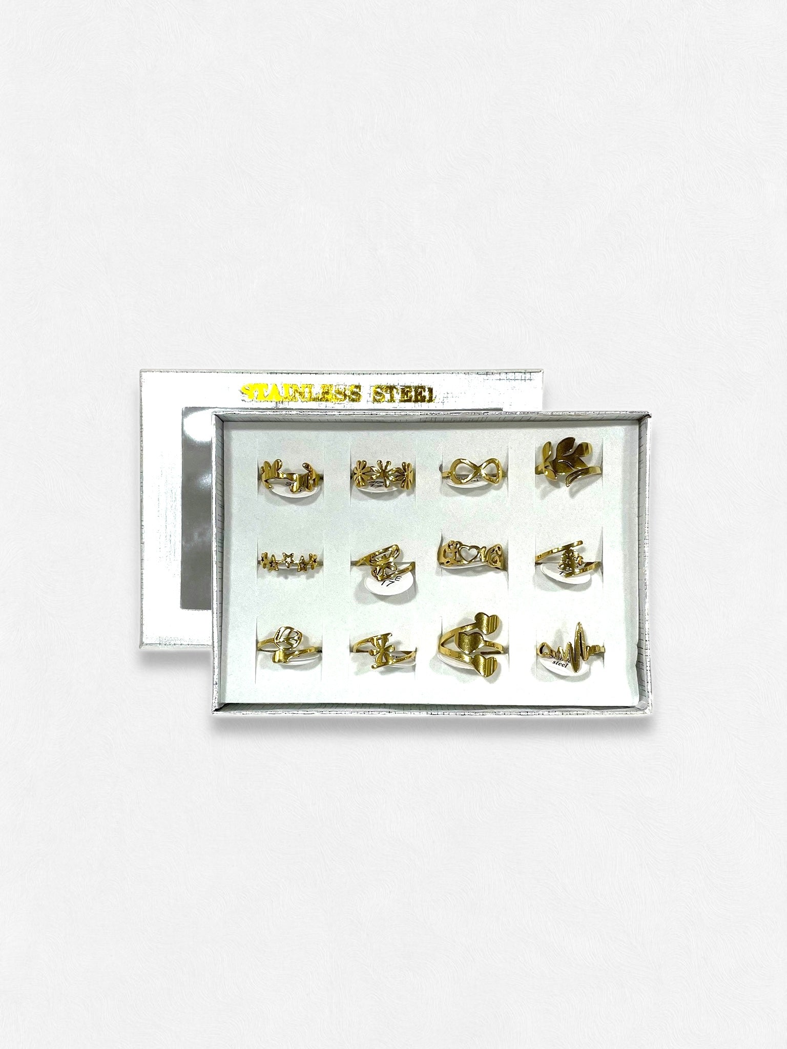 Presentación: 12 anillos en una caja. Vienen surtidos los diseños y tamaños. Los diseños se repiten de manera al azar.